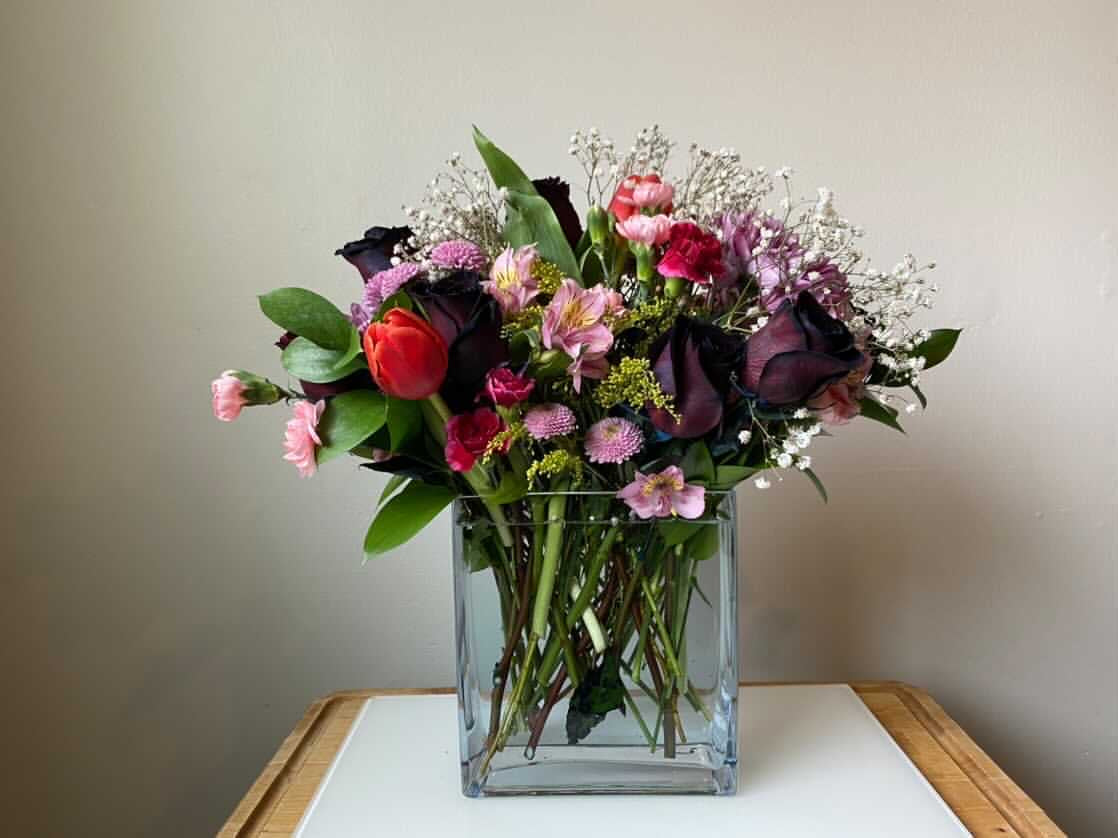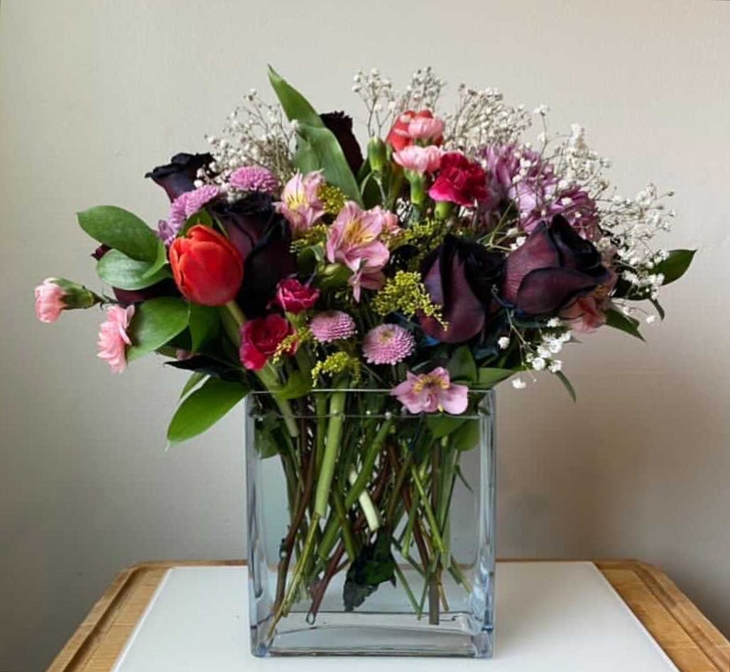 1/2 dozen Black Roses mixed in with tulips, spider mums amongst other flowers making it the perfect elegant bouquet. This Bouquet is based off dark flowers to appease your unique recipient.