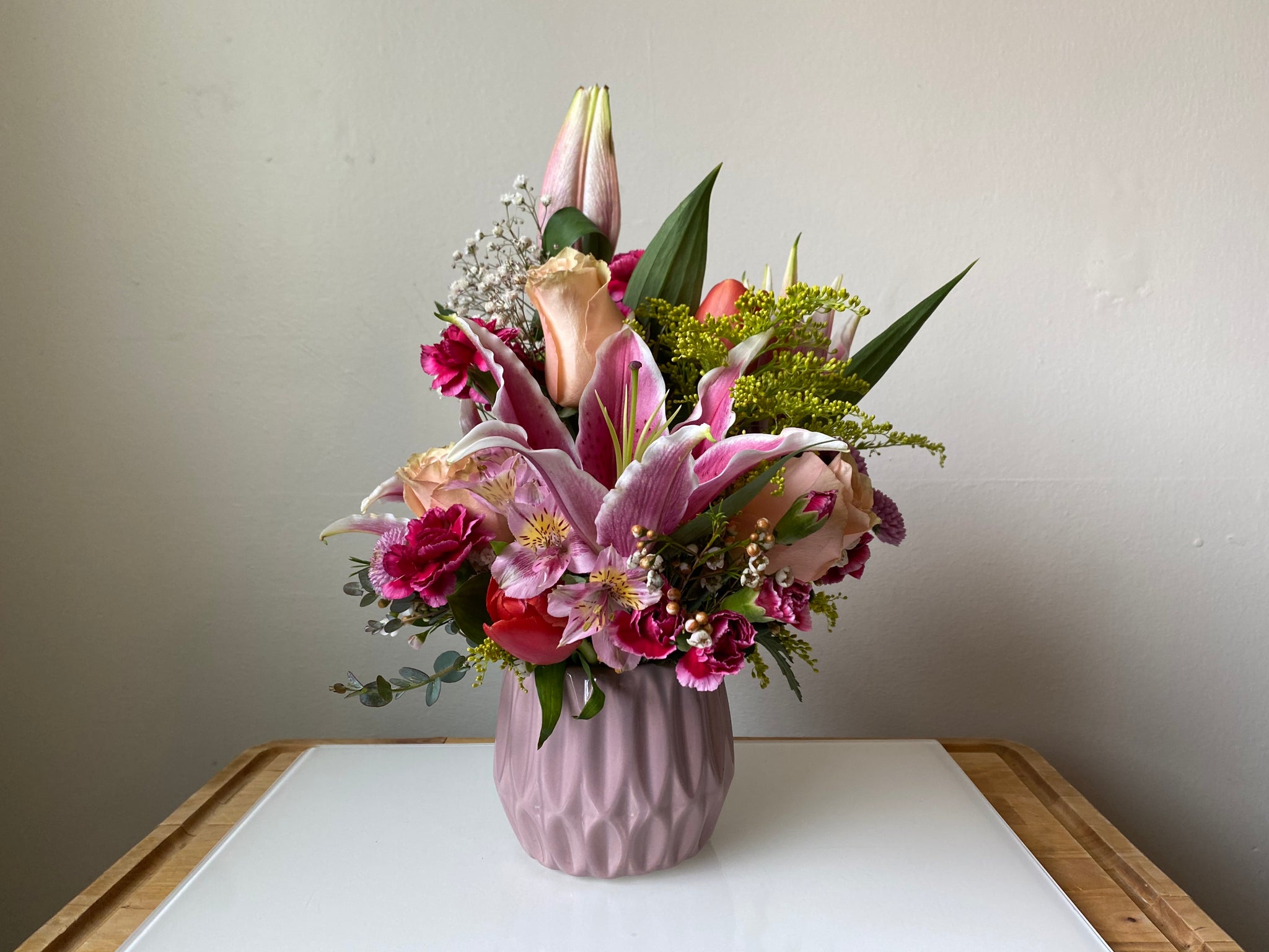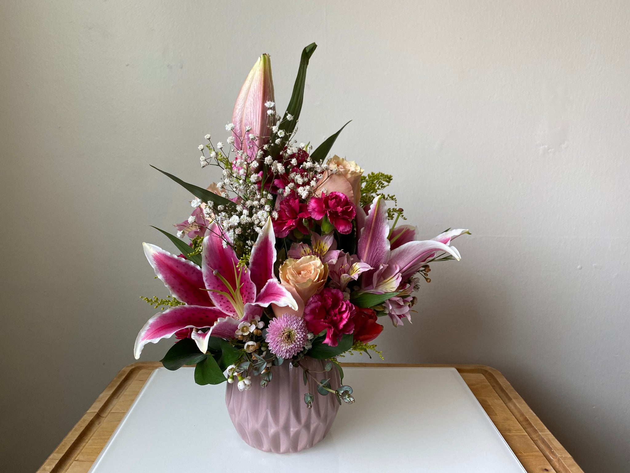 Stargazer Lilies with tulips, spider mums amongst other flowers making is the perfect elegant bouquet.